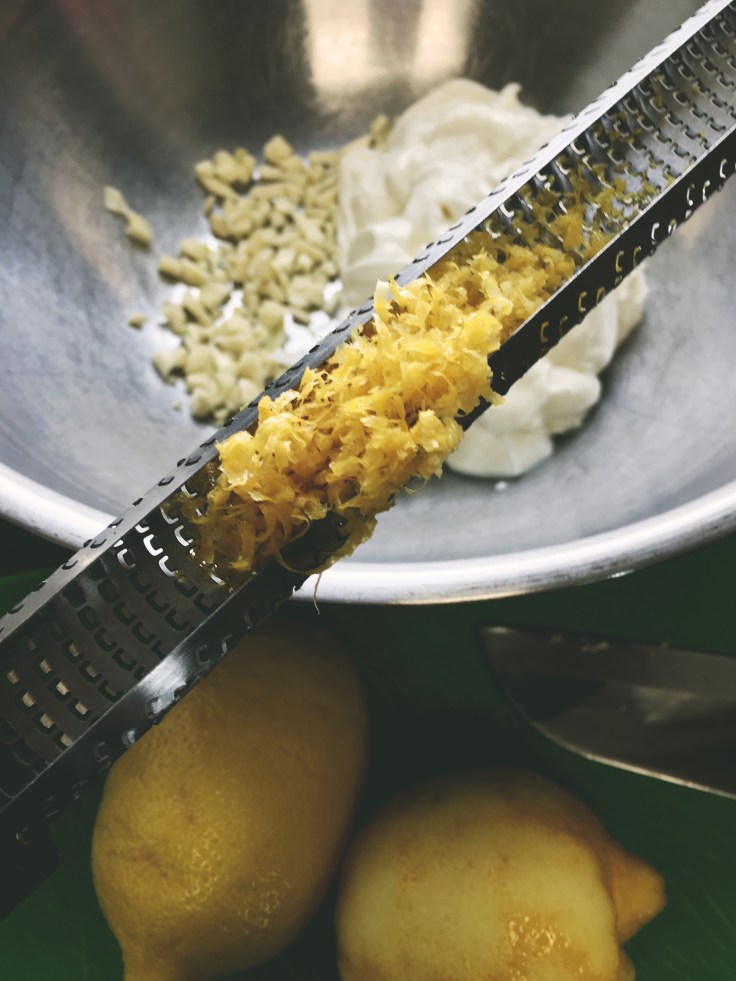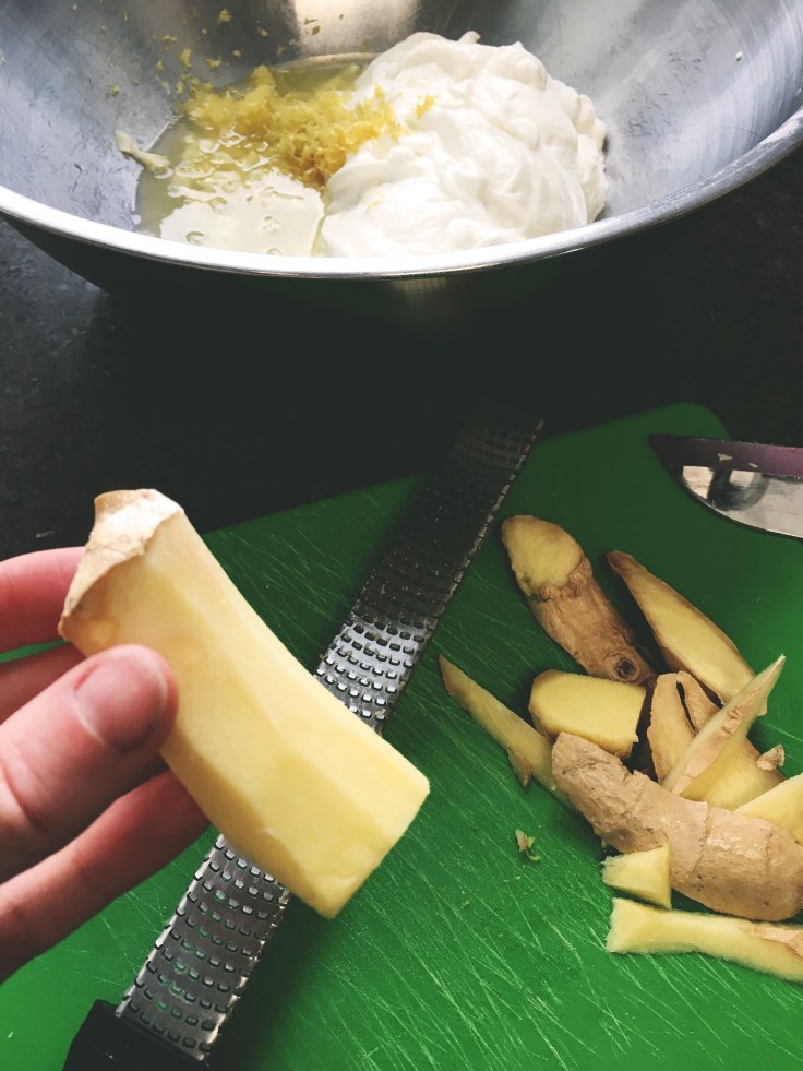 - combine the garlic, yogurt, lemon and zest, ginger and spices