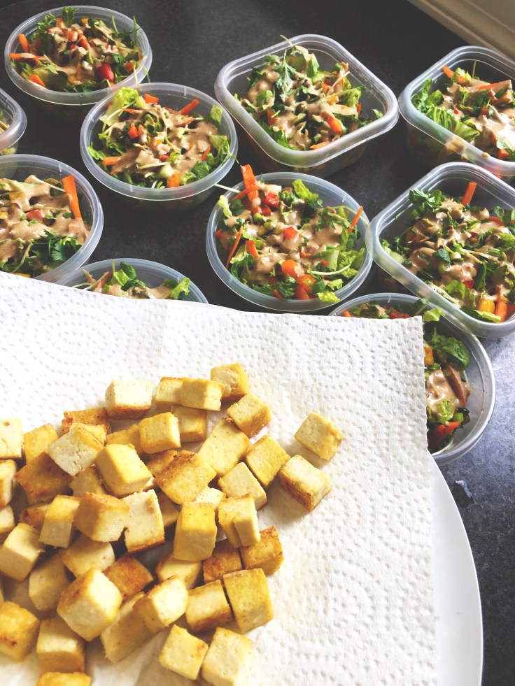at the end of the salad assembly was the decision of serving tofu to everyone or keeping more for me and the kids… decision was made that the crew would most likely think that the pressed/fried tofu was croutons, bite into them and then be disgusted that they had just ate tofu…