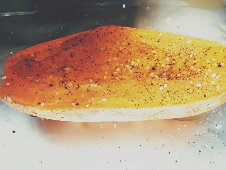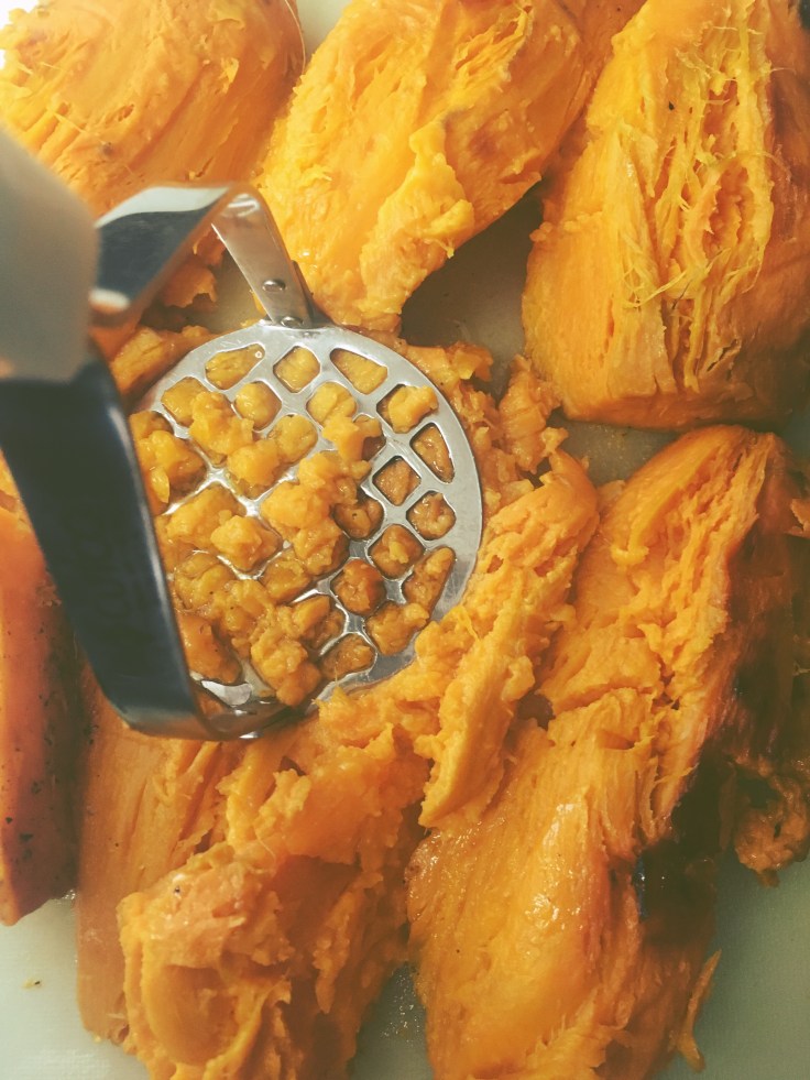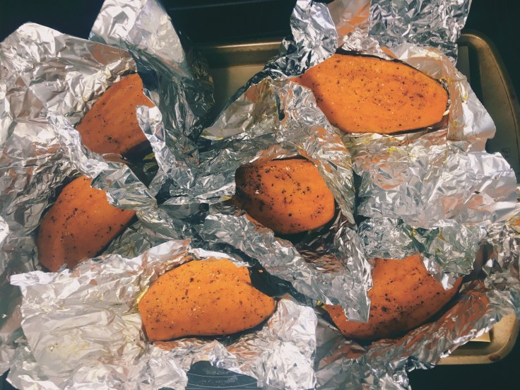 I start by cutting sweet potatoes in half, seasoning with salt and pepper and wrapping in foil with some olive oil… placing them in a 400 degree oven for 45-60 minutes to get them all gooey…