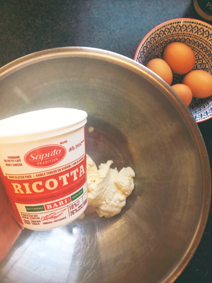 then I move on to prepping the ricotta mixture… in the past I have used cottage cheese but it doesn’t hold a candle to ricotta in my eyes! I add to the ricotta some eggs, pepper and chopped spinach and then will add the sweet potato mash when it is done