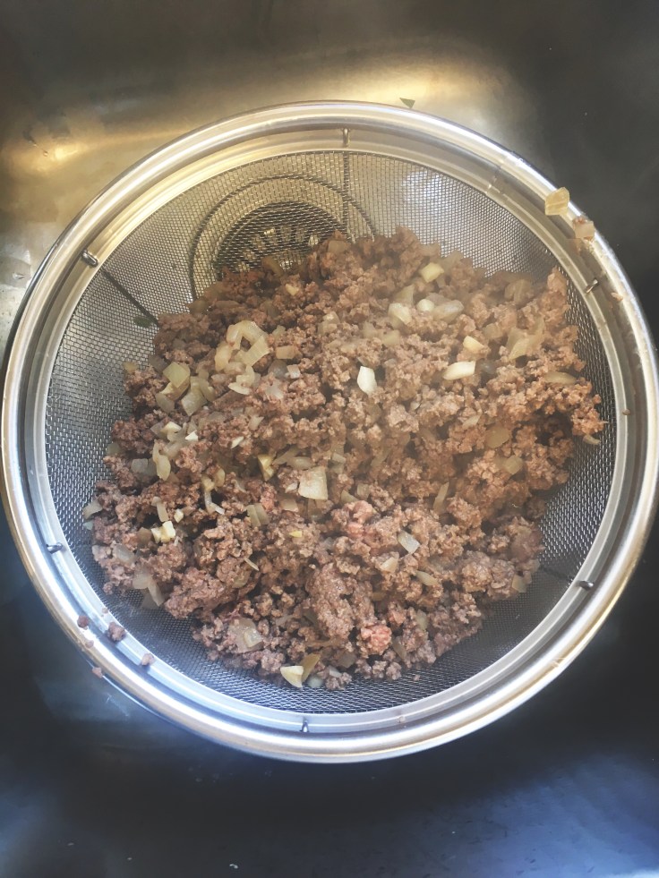 for the meat sauce (you can make this vegetarian… I always make one little vegetarian lasagna for myself… I just keep aside some marinara sauce) … I use some local ground beef, cook it up with onions and garlic and strain it… then add the spices