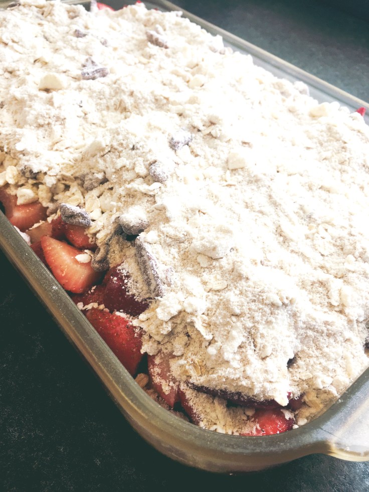 I tossed the strawberries with some freshly grated ginger and powdered ginger… topping it with a buttery, pecan, oat topping and there he has it… his ‘crisp’…