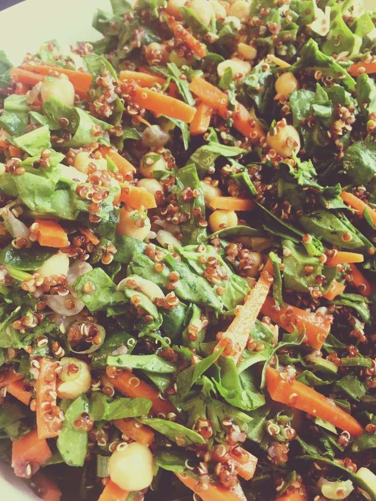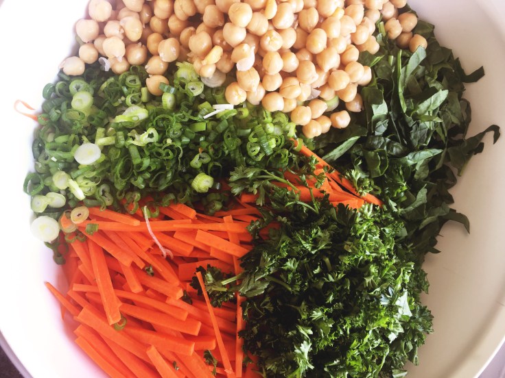 in a large bowl, add the chickpeas, spinach, carrots, green onions, parsley and tomatoes