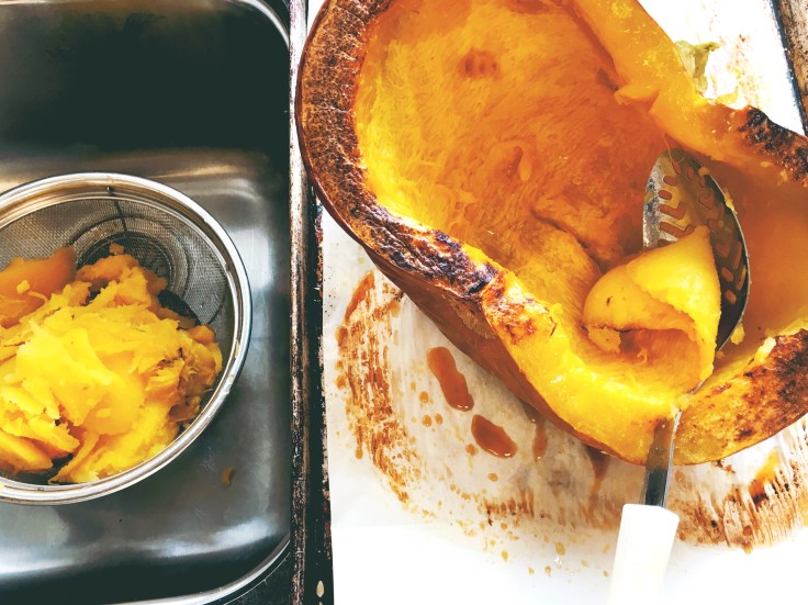 for the filling I scooped the pumpkin flesh into a strainer to drain any excess liquid off