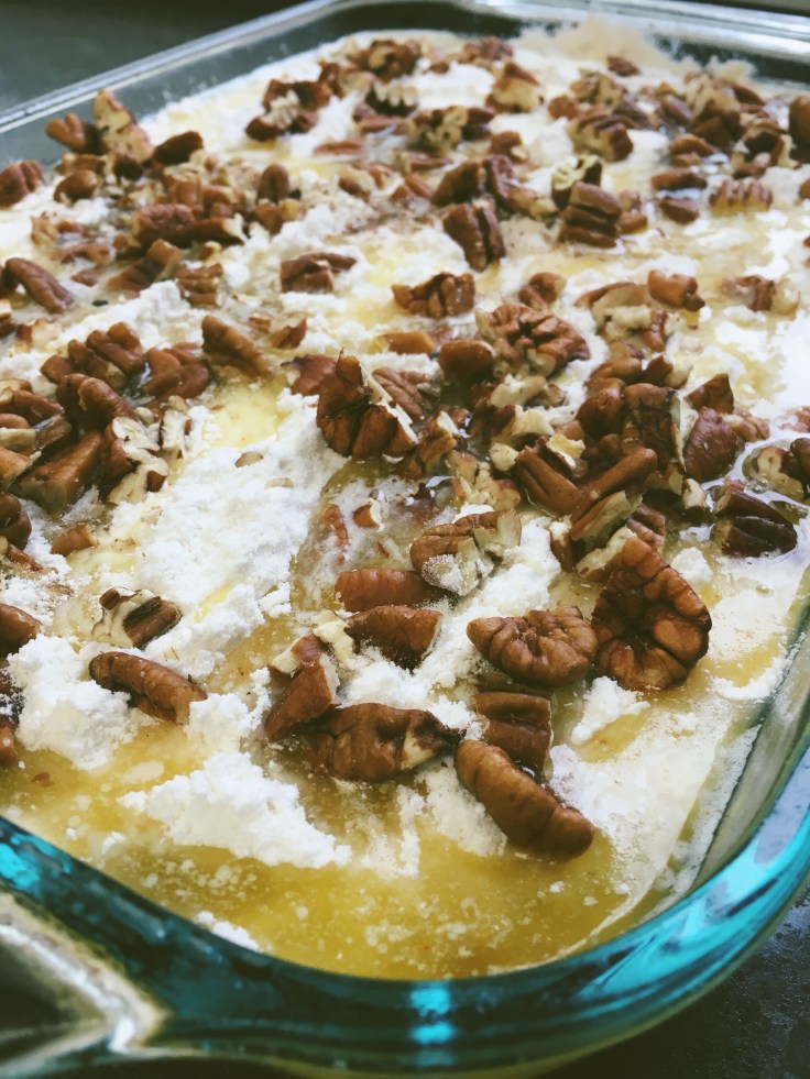 - drizzle 1 cup of melted butter over the cake mix