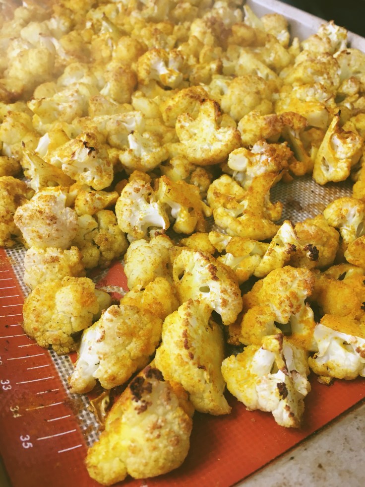 in a 450 degree oven, roast the cauliflower with the spices, sugar and oil on it until soft