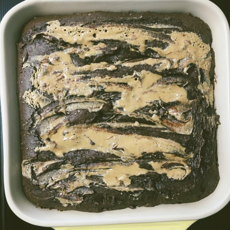 • melt 2 tbsp of peanut butter in the microwave and pour in a few dollops on the brownie batter