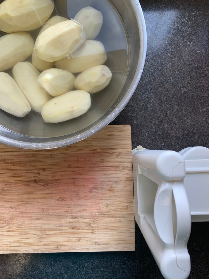 – using an inspiralizer or mandolin, thinly slice the peeled russet potatoes