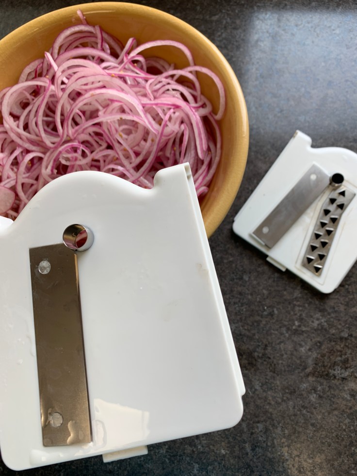 – spiralize one red onion (or use a mandolin to thinly slice)
