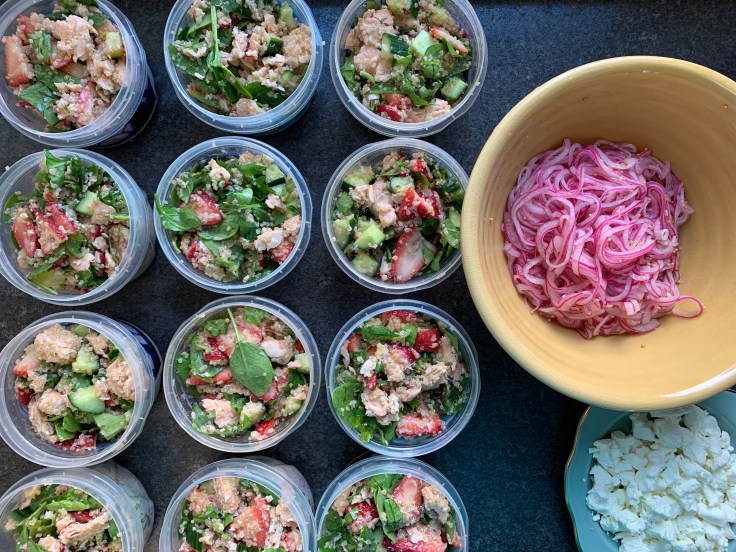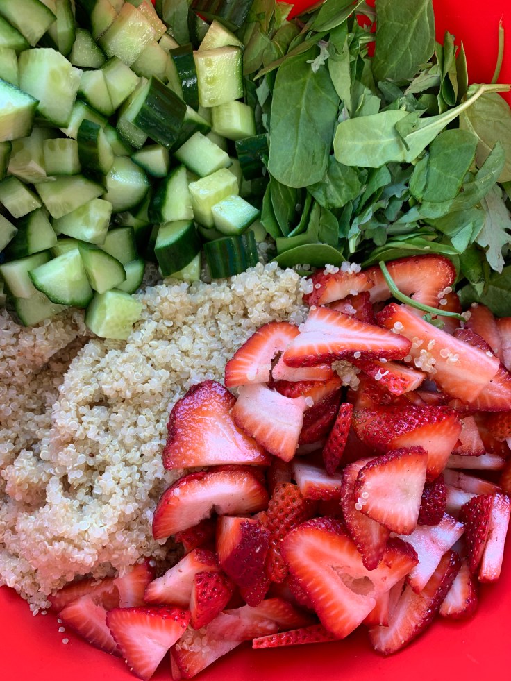 – add the cucumber, strawberries, pickled onion, goat cheese and salmon
