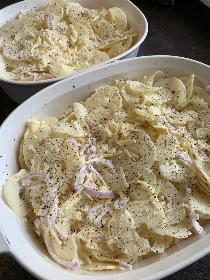 – if using a mandolin, stack potatoes in the baking dish and our cream mixture onto it and repeat until you’ve used all potatoes