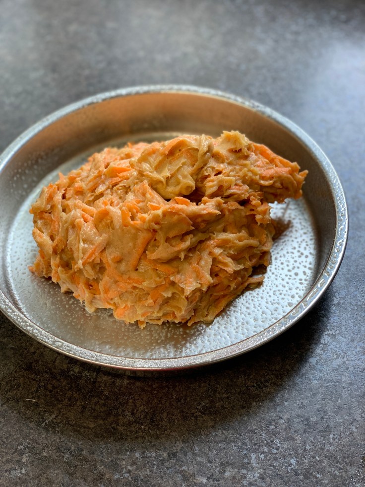 – in a 9” round greased baking pan, spread the thick carrot cake dough