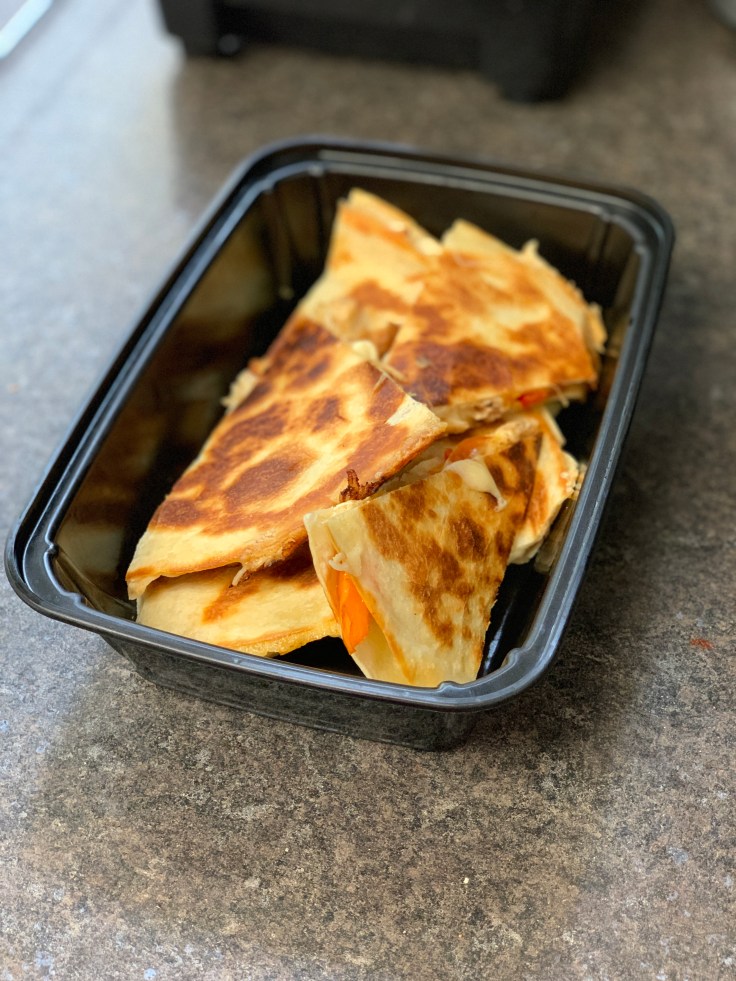 my first flip of the quesadilla I burnt my wrist… I packed little containers of sour cream with these and you could also add Pico de Gallo or Salsa if you had that kicking around
