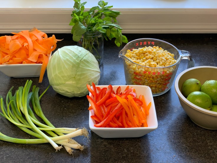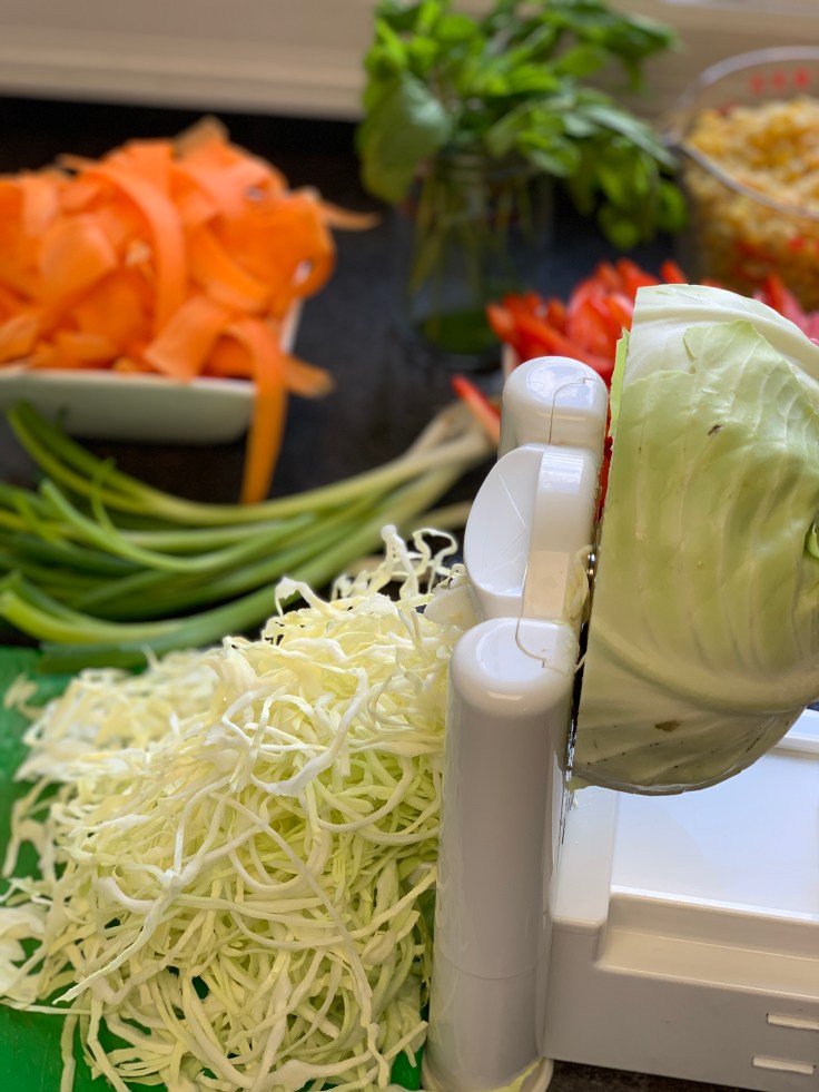 - 1 small head green cabbage, cored and finely shredded (or I use a spiralizer)