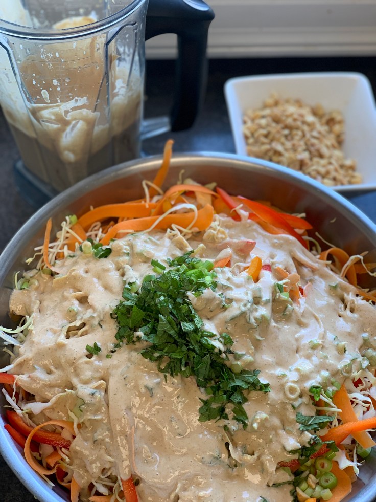 - I made the dressing in a Vitamix blender (because I tripled it) but you can either make it in a blender or just shake it together… it should be runny