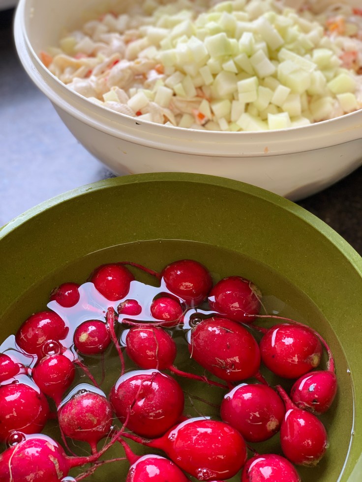 it was with great enthusiasm that I cut kohlrabi and radishes to add to the pasta salad I was taking out… until I had a Hutterite stop by to try to sell me a turkey and asked what I was making for supper – only to be told that no one likes pasta salad… and when he spotted a zucchini he informed me that those can ruin a cake pretty quickly…