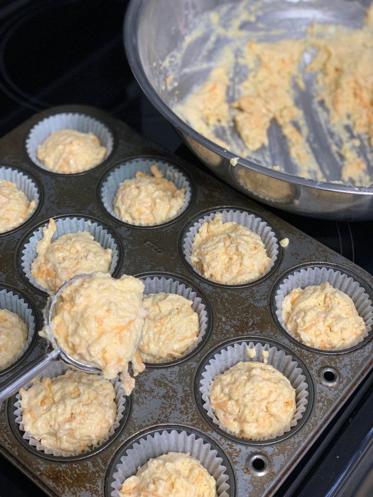 - line muffin tin with paper cups and spray them with cooking spray lightly
