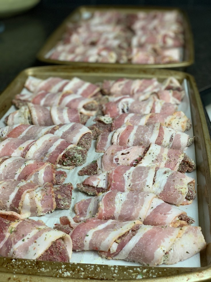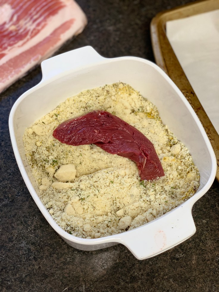 “cut the breasts into little strips… coat in shake-and-bake (I used almond flour with Italian seasoning)… wrap bacon around it and toss in the oven…”