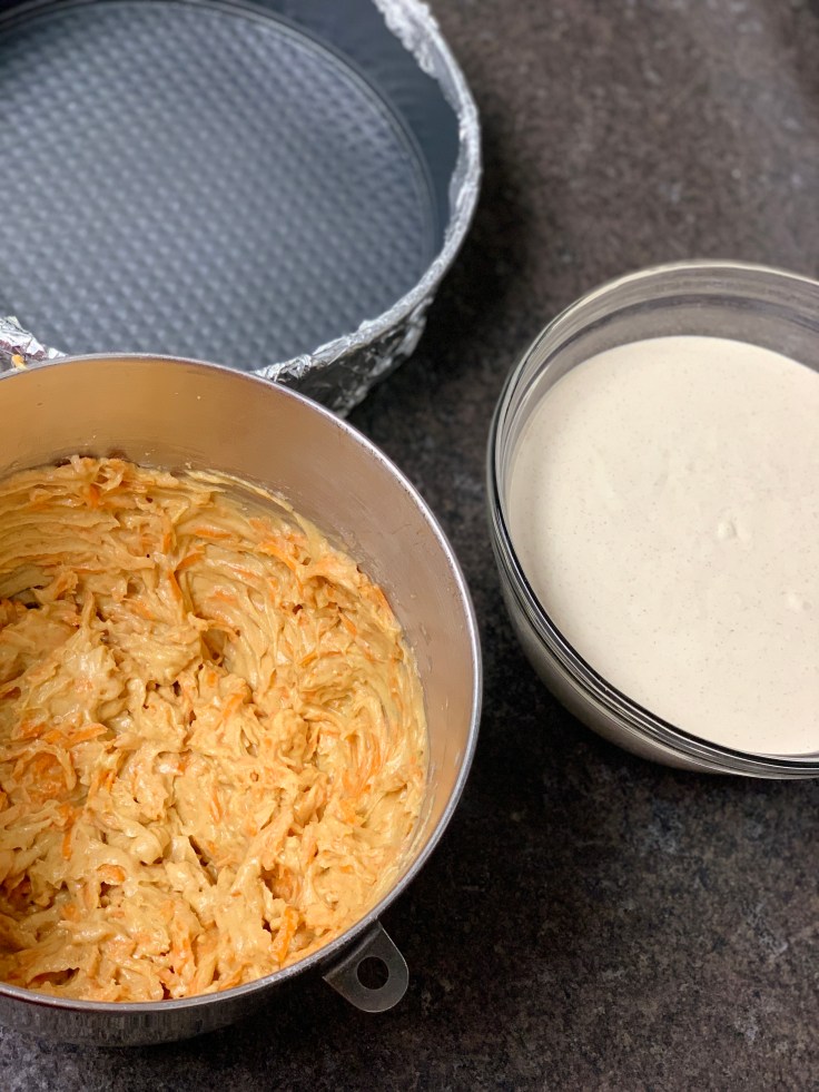 - in the springform pan, pour the carrot cake batter down first, flatten and then pour the cream cheese mixture – do not combine the two
