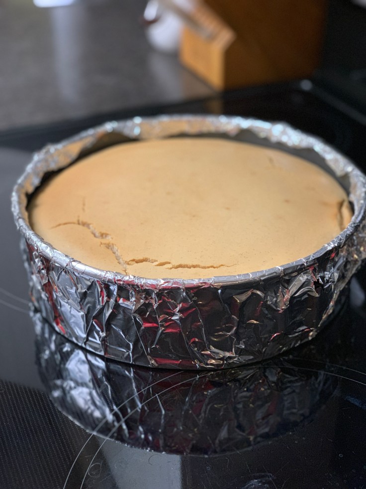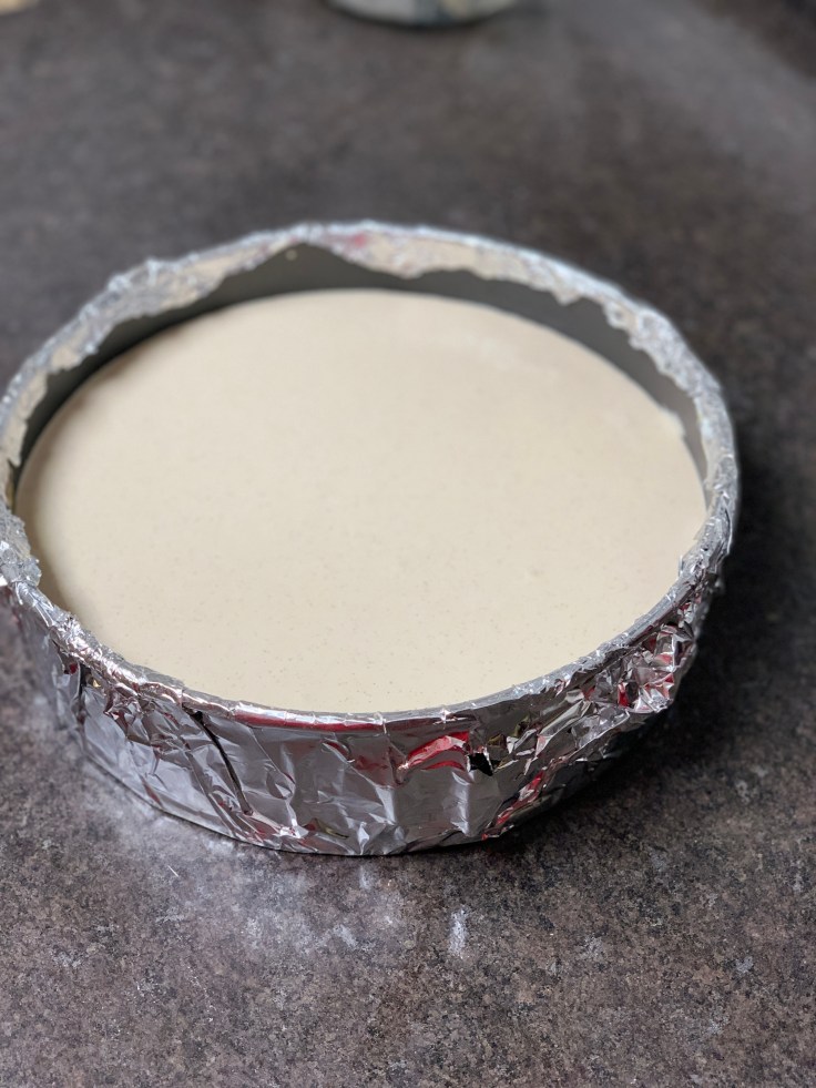 - wrap the exterior of a 9” springform pan in a sheet of foil – lightly grease and set aside