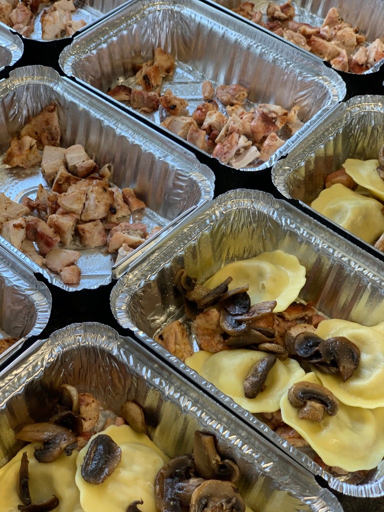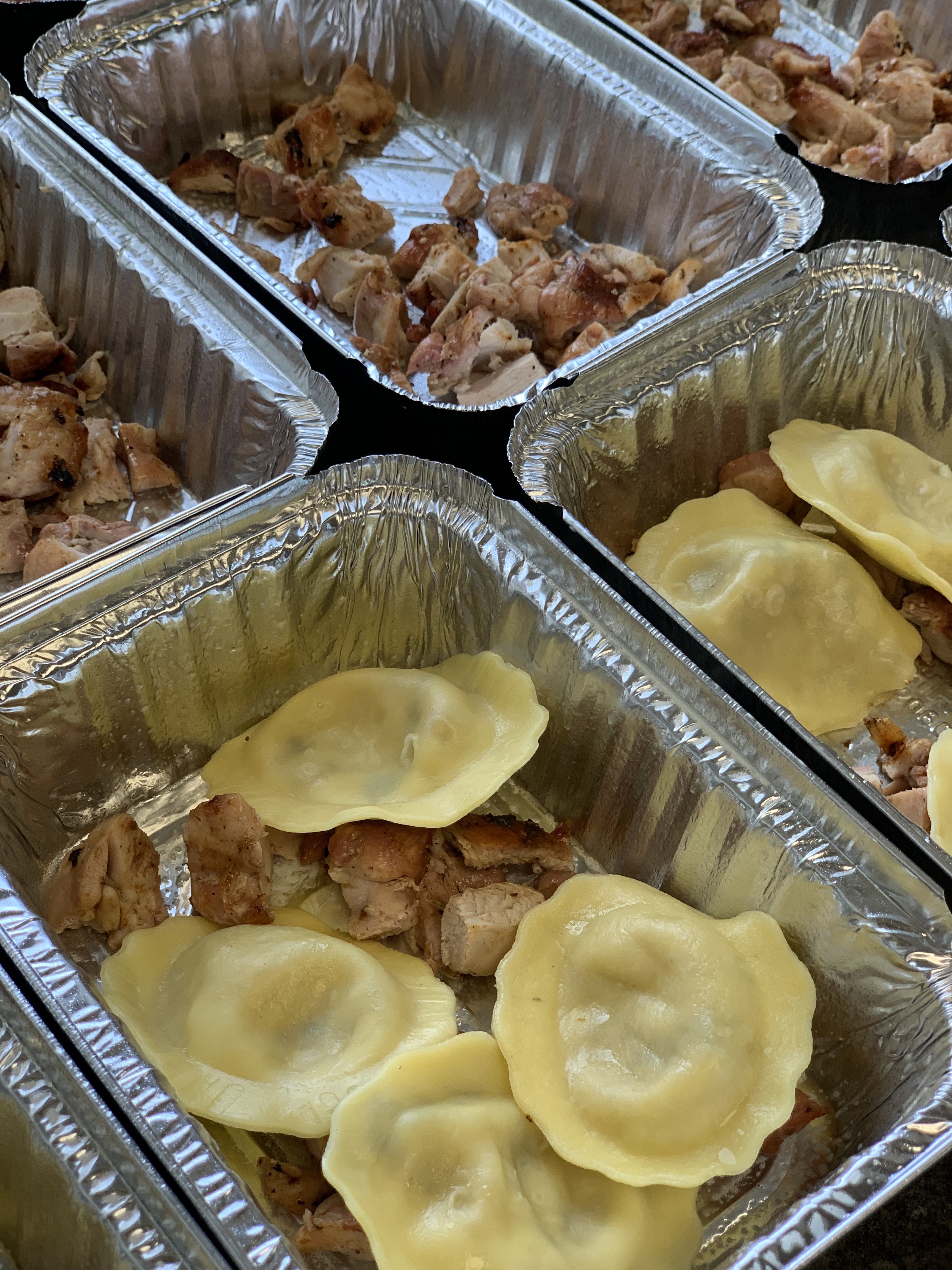 having all of this ready, you then can boil the noodles, they don’t take long, and I just use a strainer and put directly on top of the first layer of chicken… I used 6 raviolis per container…