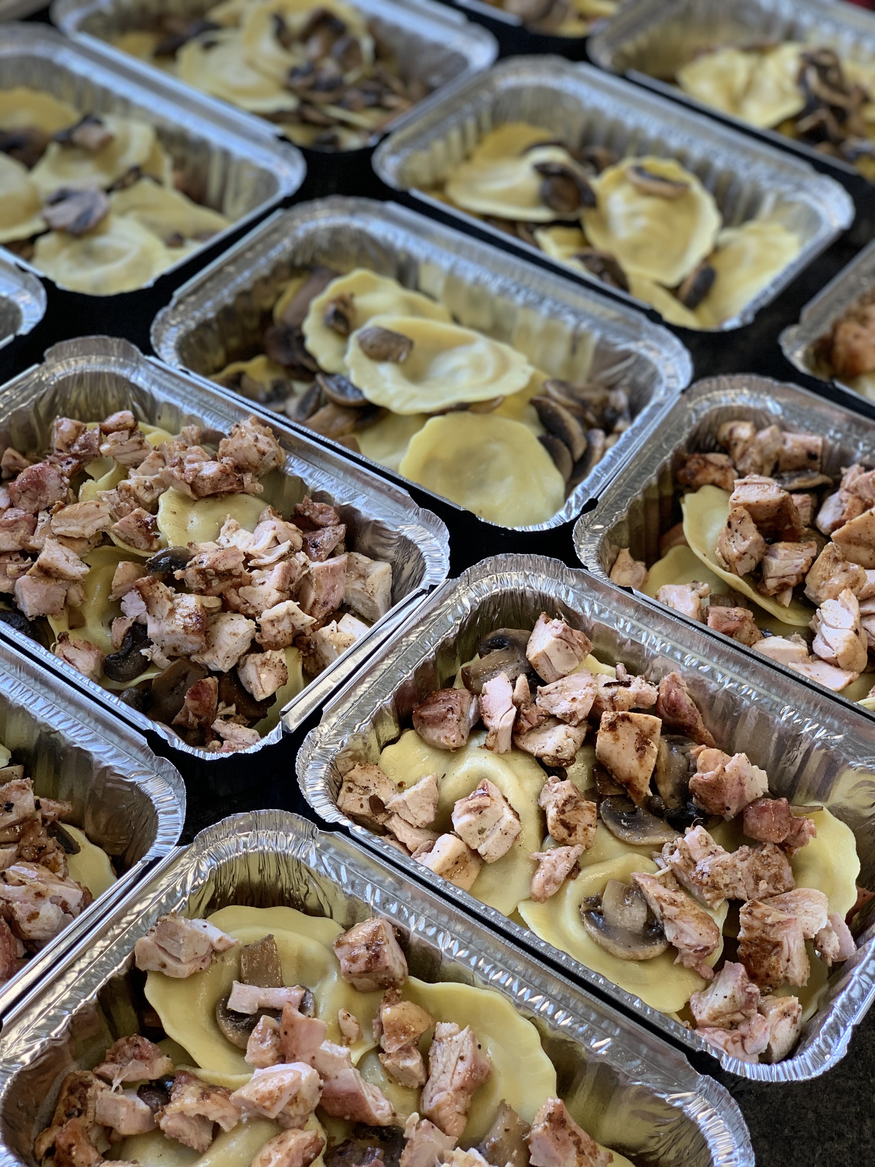 the order I assembled in was chicken, raviolis, mushrooms, chicken and then sauce…