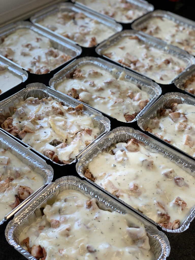 this left the noodles and sauce… I made up the sauce (your basic butter with flour and then add milk, salt and pepper and parmesan cheese or whatever cheese you like in a white sauce) and poured it into a large measuring cup so I could easily pour it over each dish…